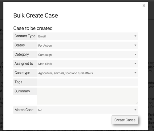 However we know that some offices prefer to assign emails to cases and then do bulk emails or mail merged letters with a response. That’s why we have now launched bulk case creation, so you don’t need to create each case manually. You will be able to select multiple emails, assign them to new cases or an existing relevant case on that constituent, and send a bulk email or mail merged letter to those who need it.