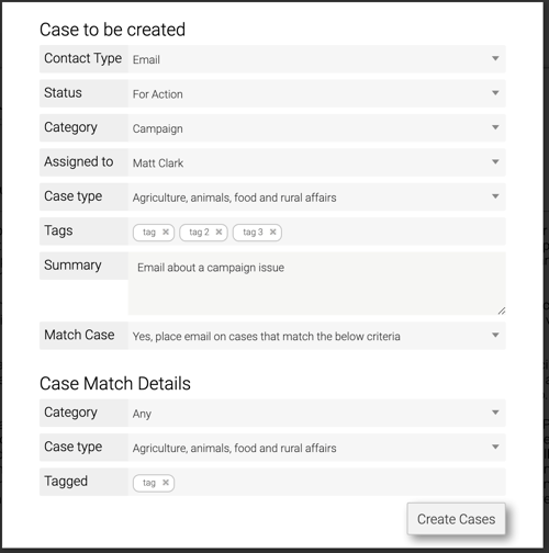 Choose whether you want these emails to be added to existing cases if they are present. This means that, if you want, you can only send an email or letter to cases that have been created recently, and exclude those who you’ve spoken to before.