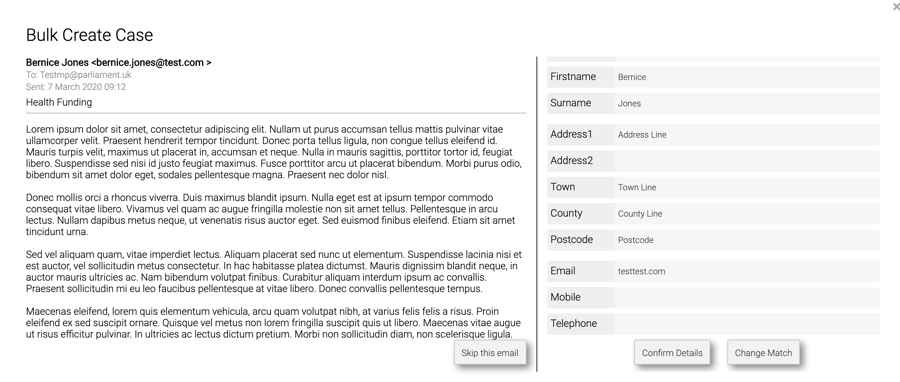 If the email addresses in your list match against existing constituents, then the new cases will be placed against those records. If there are no matching emails addresses then you will be shown matching names in your system. If there’s none of those then you can search for someone you've already created, or create a new constituent either by entering the details yourself or searching the electoral roll manually.