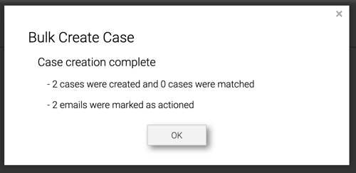 When you’re done, you will be told how many cases were created, and how many were matched to existing cases, then the emails will be marked as actioned and removed from your inbox.