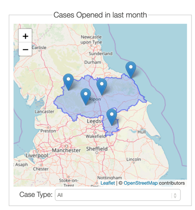 Many PCCs cover large geographic areas, containing many different towns and villages, or just varied parts of entire cities. With Caseworker you'll see all of your interactions logged onto our cases map, letting you know exactly which areas are contacting you about which issues - giving you valuable insight into the priorities of different areas. The map can also be filtered by 'case types', policy areas that you select for your own system as part of the set up process.