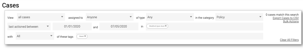 On the statistics page you can can decide to look at only stats on Casework issues, or just policy issues. While on the Cases tab you have full flexibility to find the granular detail you're looking for